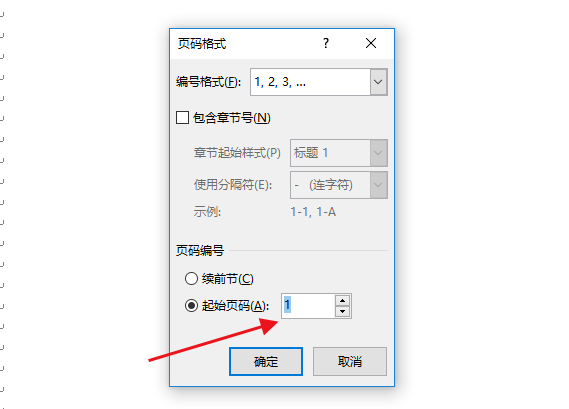 6、在弹出的窗口中选择“起始页码”,填上“1”,选择“确定”。