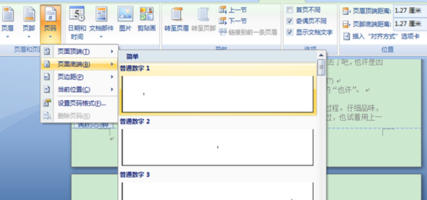 8、这时候再次选择“页码”中的“页面底端”,这次将“页面底端”选择为“普通数字1”,此时就可以完成用word设置奇偶页码的左右分布。