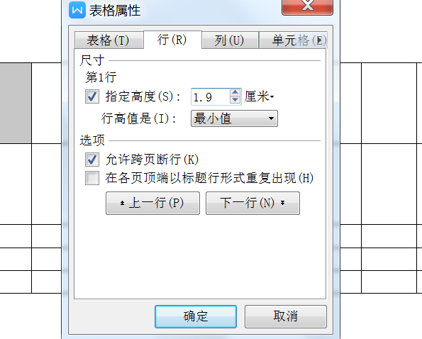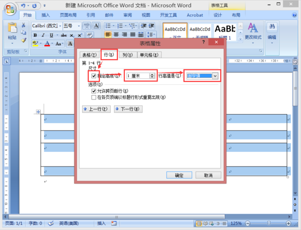 4、在弹出的“表格属性”对话框中,选择“行”选项卡,然后勾选“尺寸”下面的“指定高度”,并输入指定高度,如下图所示的:1厘米,并在“行高值是”后面选择:固定值即可。