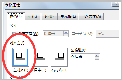 3、然后在打开的对话框中点击“表格”对齐方式为“左对齐”。