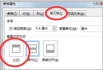 4、然后切换到“单元格”中设置“垂直对齐方式”为“上”选项。