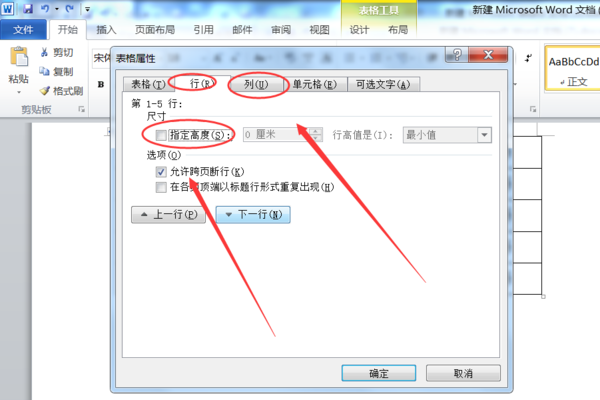 2、在行标签页中取消“指定高度”前面的选勾,然后点击列标签页。