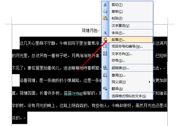 1、选中前两段(举例比较)文字,右击,选择“段落”。