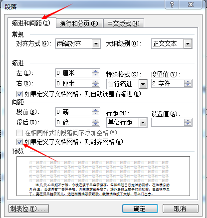 2、在“缩进和间距”选项卡,可以看到“行距”设置正常。但是勾选了“如果定义了文档网格,则对齐网格”,把这一选项取消勾选。