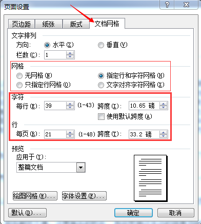 4、“文档网格”在“页面设置”定义。点击“文件”-“页面设置”,选择“文档网格”选项卡。这里可以定义文档行和字符的网格。