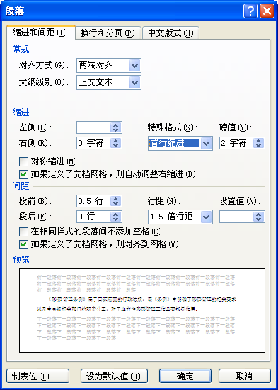 WORD中设置正文各段【首行缩进2字符、1.5倍行距、段前间距0.5行】怎么弄