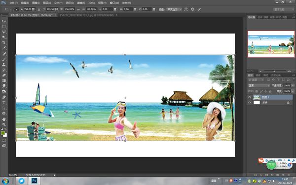4、打开要制作广告的图片素材,拖进背景文件里,ctrl+t调整大小、位置;