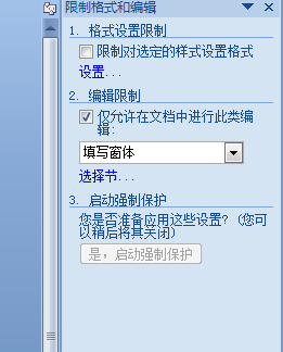 在【工具】菜单中选中【保护文档】,在右边的窗口单击【仅允许在文档中进行此类编辑】复选框,再单击【是,启动强制保护】。