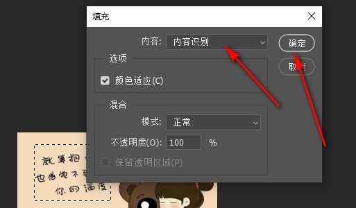 4、把文字框选后,按Shift+F5,调出填充界面,系统默认填充是内容识别,然后点击确定。