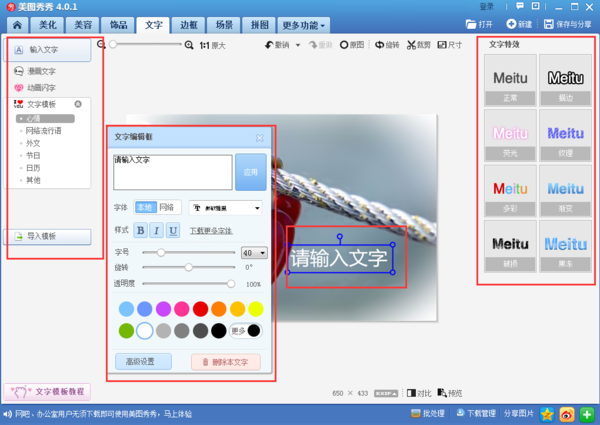 4、接着我们在来到“文字”页面,点击“输入文字”然后自己想说的话即可。我们还可以通过美图秀秀自带的各种功能更改字体样式特效等,更改完毕后点击保存就可以了。