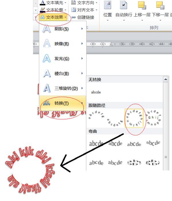 5、选中艺术字,在“文本效果”中选择“转换”,在“跟随路径”中选择“上圆弧”,跟你圆形调整字体和文本的格式,使之和圆形相匹配。