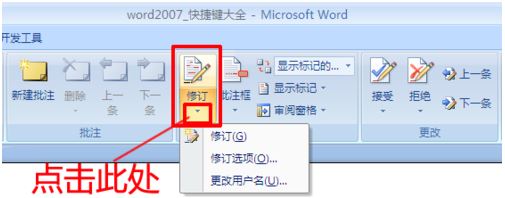 在“审阅”下方,找到“修订”,点击“修订”下的向下箭头,出现下拉菜单,如下图所示: