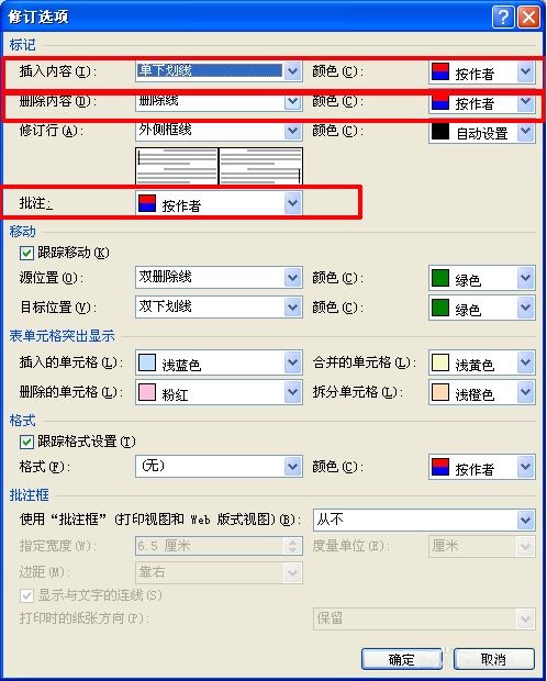 在弹出的修订选项设置框中,可分别设置修订插入内容颜色,删除内容颜色,以及批注颜色,如下图所示: