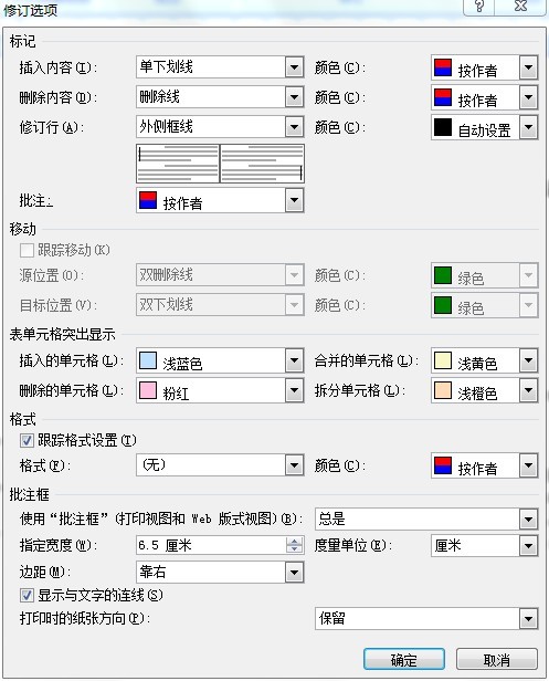 5.在弹出的修订选项设置框中,可分别设置修订插入内容颜色,删除内容颜色,以及批注颜色,如下图所示: