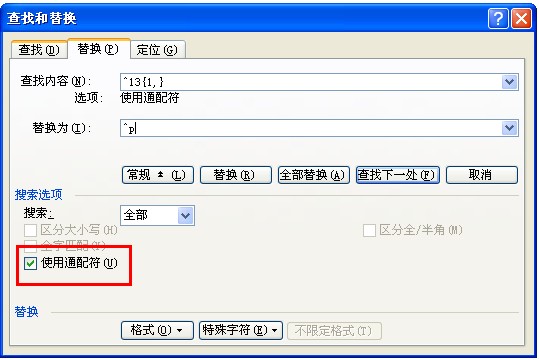 按CTRL+H打开替换对话框,单击高级,勾选使用通配符,在“查找内容”框中输入^13{1,},在替换为框中输入^p,单击全部替换