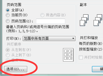 3、即可打开打印设置的对话框,在对话框中点击左下角的“选项”按钮。