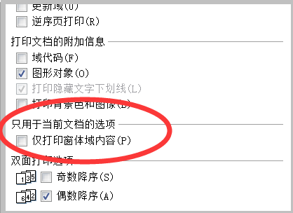 4、即可进入“打印选项”设置的页面,将“只用于当前文档的选项”下的“仅打印窗体域内容”前面的勾选框取消勾选,点击确定。