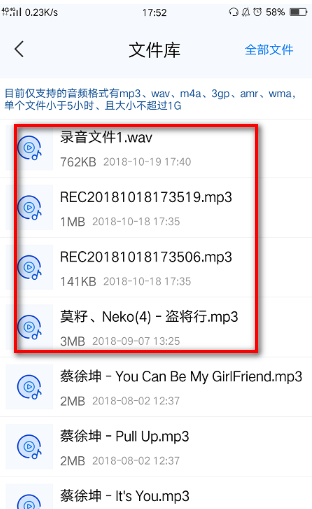 点击进去之后是“文件库”,然后在文件库里点击添加要进行转换的音频文件进行转换