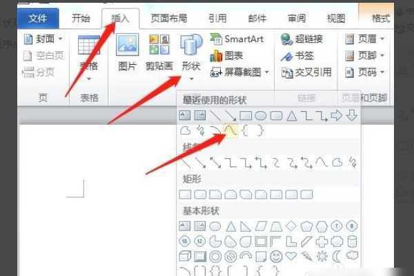 4、然后单击“插入”选项卡,形状函数中的曲线。如图所示,按红色箭头所示顺序绘制三个点,绘制曲线。