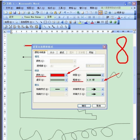 6,花完图形之后还可以对它进行进一步的加工,双击画好的图形,弹出“设置自选图形格式”窗口——”颜色与线条“可以进行设置图形的颜色,粗细,如图8所示。这些简单的图形,经过加工之后好看很多,如图9所示。