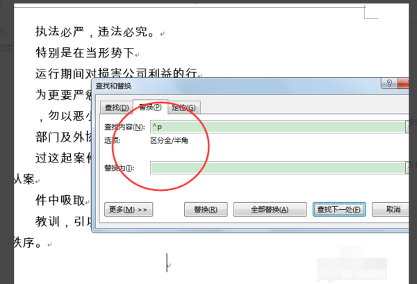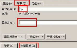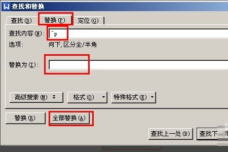 3、然后在 Word 替换窗口查找中输入 "^ p", 将其替换为无填充, 然后单击 "全部替换" 以确保正常。