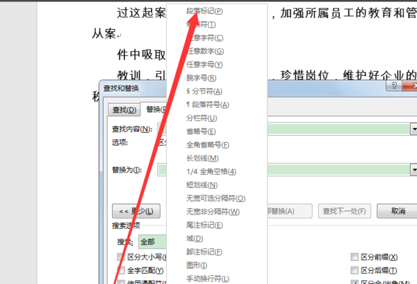 3、然后我们选择复制替换后段落后面产生的空格,之后点击打开替换,粘贴到查找内容框内,点击全部替换即可。