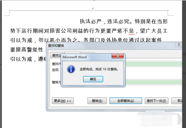 5、替换方法是,也是全选,调出替换窗口,在word替换窗口查找内容中输入“ ”这个是复制段落前的空格,替换为不用填,然后点击全部替换,确定就可以了。