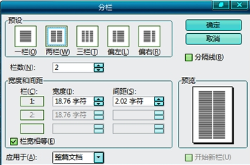 1、在“页面布局”功能区中单击“分栏”按钮,打开一个下拉菜单,从中选择“更多分栏”命令,打开如下图所示的“分栏”对话框。