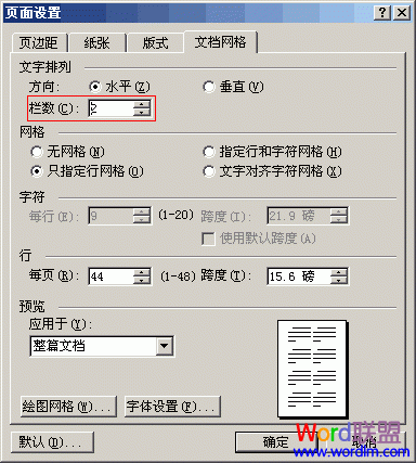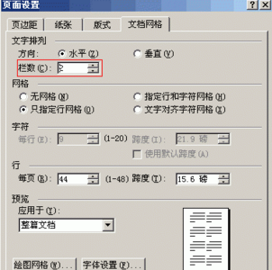 首先打开Word文档,然后单击菜单栏的“文件”,在弹出菜单中选择“页面设置”,然后选择“文档网络”,在“文字排版”下的“栏数”中修改参数,如要分两栏可设定“2”,如分三栏可设定为“3”。修改完成后,可以在下面的“预览”中查看效果。(如图)