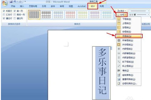 5、切换到“设计”标签,找到“边框”工具,在下拉列表中,选择“无框线”,可把辅助表格隐藏。效果如下图。