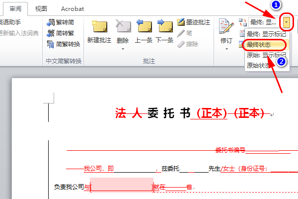 3、点击修订状态的三角下拉箭头,然后选择“最终状态”;