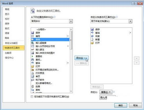 2.在打开的“Word选项”对话框中切换到“快速访问工具栏”选项卡,然后在“从下列位置选择命令”列表中单击需要添加的命令,并单击“添加”按钮即可,