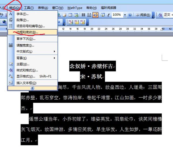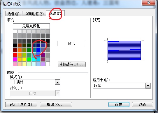 3、单击“格式”菜单下的“边框和底纹”,在“底纹”选项卡中选择“蓝色”