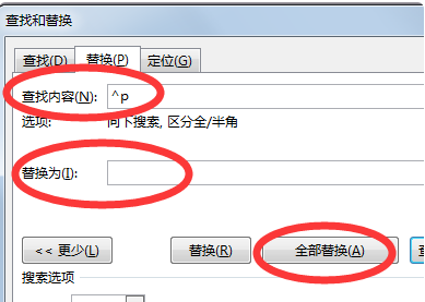 4、在打开的“替换”对话框中的查找内容中输入“^p”,在替换为中空置不填,直接点击全部替换按钮。