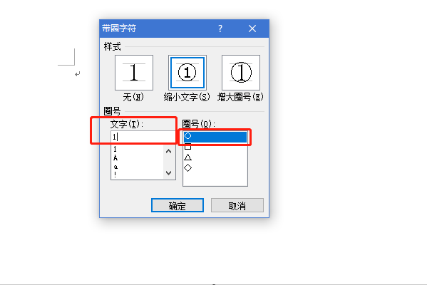 2、点击“字”图标,弹出带圈符号设置框,样式有三种可选择,根据需要选择则可,这里示例选择第二个,带圈缩小文字;