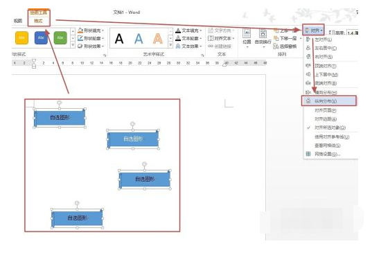 (1)可以对多图形同时进行对齐操作。按住Ctrl键不放,使用鼠标依次选中图形,然后在“绘图工具-格式”选项卡“排列”组,单击“对齐”,然后从列表中选择合适的对齐方式,如“纵向分布”。