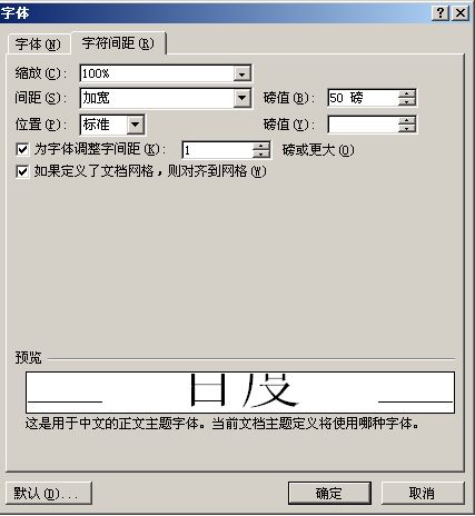 间距:选择“加宽”,相应的磅值:输入适合的磅值,例如:输入50,输入完成后,点“确定”按钮。