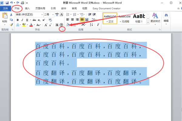 1、打开需要操作的WORD文档,选中需要调整字符间距的文本,在开始工具栏中找到字体一项,点击右下角的展开按钮。