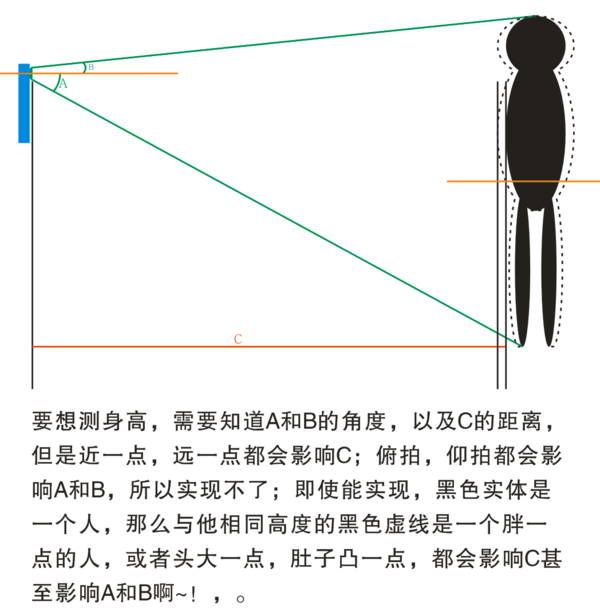 除非同时具备测距,测角度的条件,通过勾股定理算出身高,但问题是,已经具备测距功能了,那干嘛还得多此一举测角度算身高呢?直接让被测者站直,测脚底到头顶的距离不就是身高了嘛~!如果要实现测距,测角度的条件,手机上除了相应的APP软件外,还需要硬件设备,现在最小的红外测距仪也有对讲机那么大,还不具备测角度的功能,手机厂商是不可能把这种鸡肋似的设备往手机上加的,即使加上了,那也得是大哥大那么大的手机了。因此,硬件是制约,实现不了。其次,也许你说不想让被测者知道你在量他身高,那从法律及道德方面讲,国家相关部门也不允许手机厂商大规模普及这类偷排性质的测量软件,毕竟这个功能要在大众手机上实现,很多间谍就可以拿着手机大摇大摆测试国家机密性的建筑或者地形了。因此,无论是技术上,还是法律道德层面讲,你想要的这个功能都不可能实现。