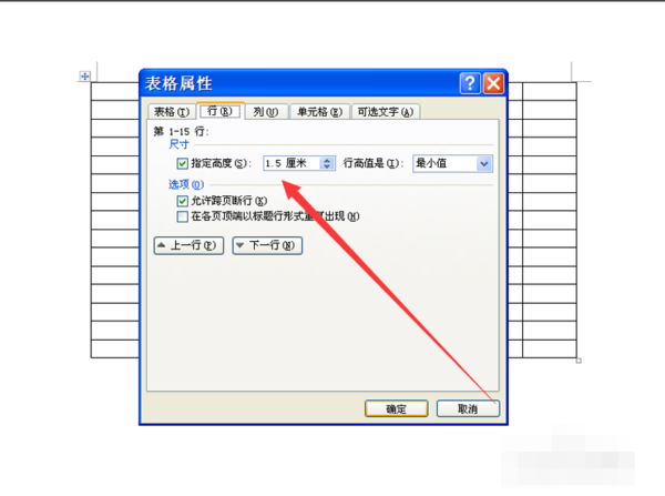 4、在弹出的表格属性对话框中设置行为指定高度1.5cm,同样设置列为1.5cm,点击确定按钮。