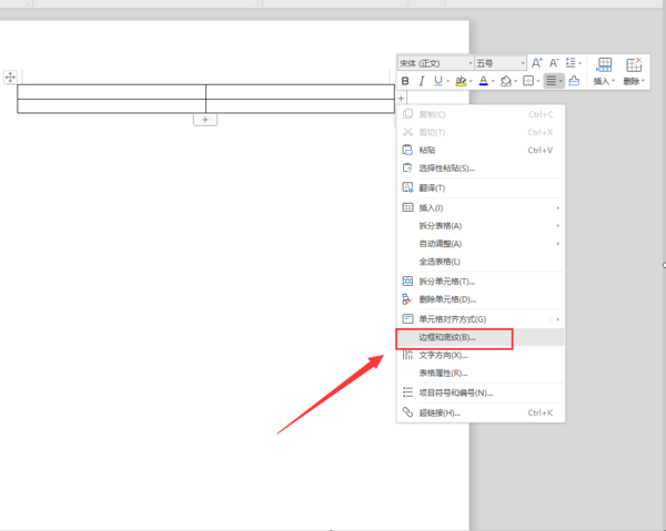 3、选中表格,单击鼠标右键,选择“边框和底纹”选项。