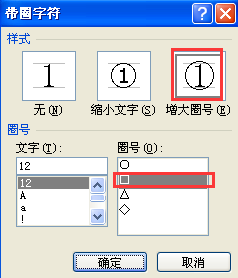 3、弹出带圈字符对话框,在样式处选择增大圈号,在圈号处选择方框即可,如图所示。
