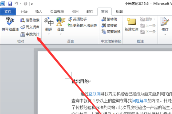 3、选择校对功能中的字数统计,这个功能默认是针对整个文档,如果选中某些文本时,会对选中文本进行统计;