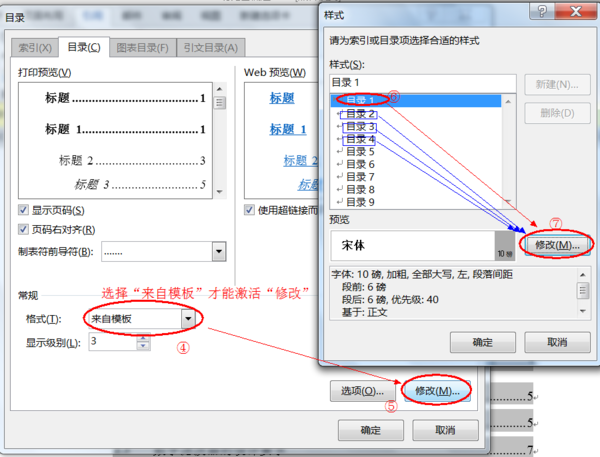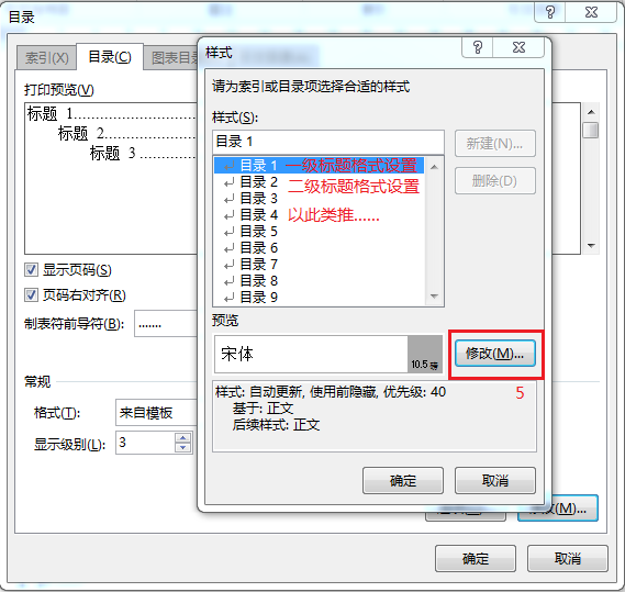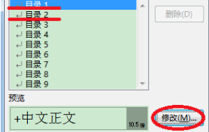 3、在按下“修改…”后,弹出样式对话框,如下图所示,其中,目录1、目录2等为目录级别,我们这儿有两级目录,可分别选中后,进行修改: