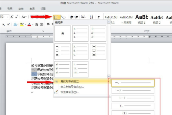 7、如果编号级别不对,可以点击上方的“编号”按钮,在下拉框里点击“更改列表级别”,然后选择相应的级别,word自动就会编号。