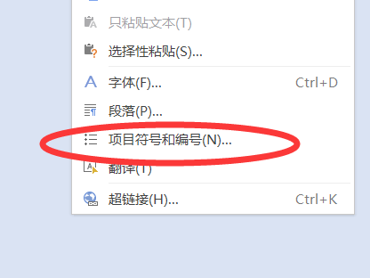 2、然后右键点击该选中的文字,并选择打开选项中的“项目符号和编号”选项。