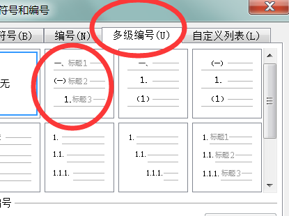 3、在打开的“项目符号和编号”对话框中选择“多级编号”选项并选择其中需要的编号样式。