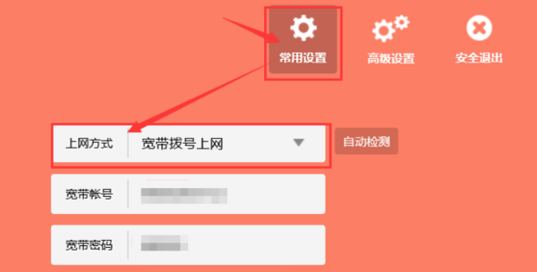 3、进入后点击页面下方的上网设置,然后点击上方的”常用设置“上网方式点击成宽带拨号上网,然后输入运营商给你的宽带账号和宽带密码,最后点击宽带密码下方的保存键就可以了。