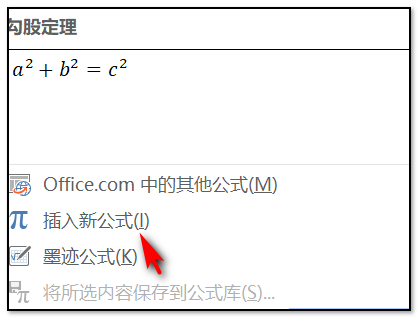 4、选择公式以后,在公式的下拉选项中选择并点击“插入新公式”;
