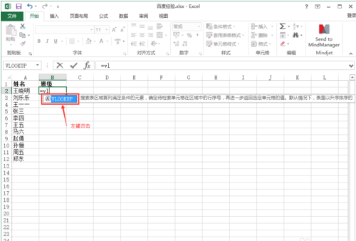 3、在单元格中输入“=vl”,然后会自动提示出VLOOKUP函数,双击蓝色的函数部分。